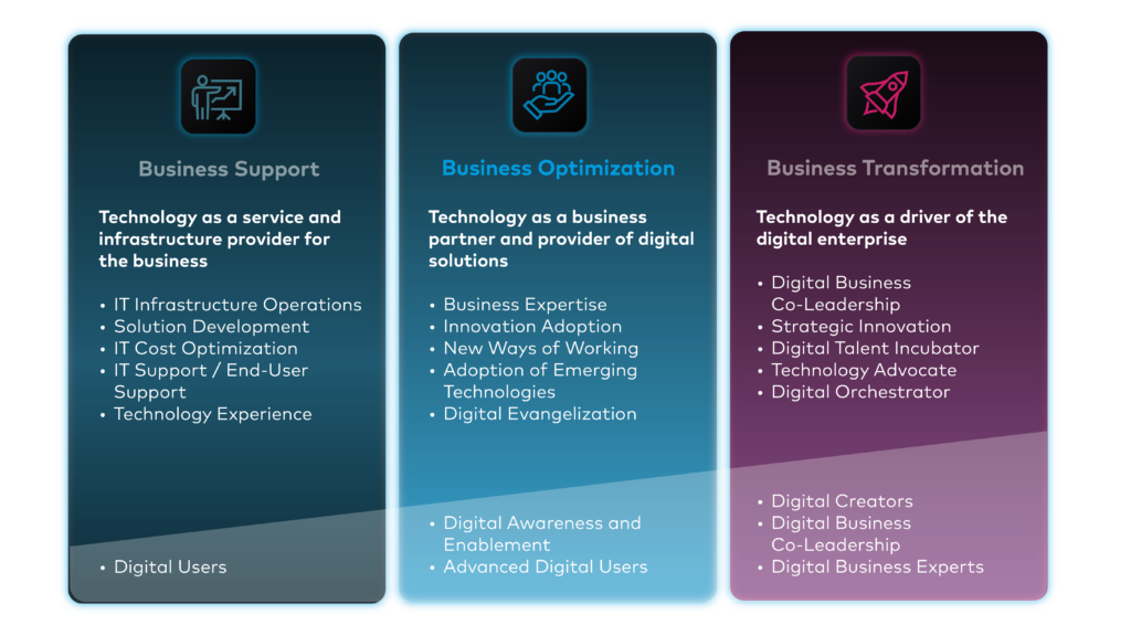 In the technology domain, the focus evolves from infrastructure management toward strategic leadership and digital innovation. Technology moves from ensuring operational stability to becoming a driver of growth and adaptation.