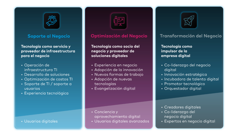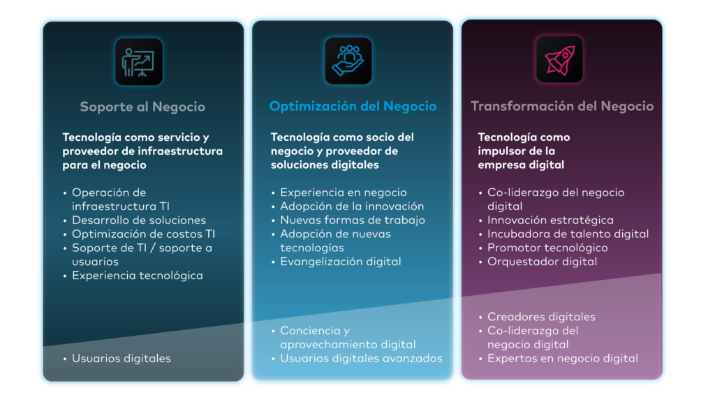 Como socio estratégico del negocio y proveedor de soluciones digitales, el área tecnológica debe reforzar su conocimiento del negocio, impulsar la innovación, adoptar nuevas formas de trabajo e integrar tecnologías emergentes. Además, la evangelización digital desempeña un papel clave en la consolidación de una cultura de transformación, asegurando que todos los stakeholders comprendan y respalden las iniciativas digitales.